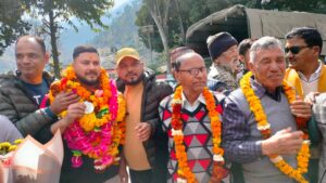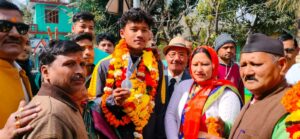 गौचर : देहरादून के महाराणा प्रताप खेल स्टेडियम में आयोजित राष्ट्रीय खेलों के तहत नेटबॉल में रजत पदक विजेता गौचर निवासी मुकेश नेगी व वेदांत टाकुली के गौचर पहुंचने पर नगर वासियों ने उनका गाजे – बाजे व फूल मालाओं के साथ गर्मजोशी से किया स्वागत।