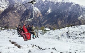 औली में बर्फबारी के बीच पर्यटकों ने किया स्कीइंग, चेयर लिफ्ट से निहारे बर्फीले नज़ारे