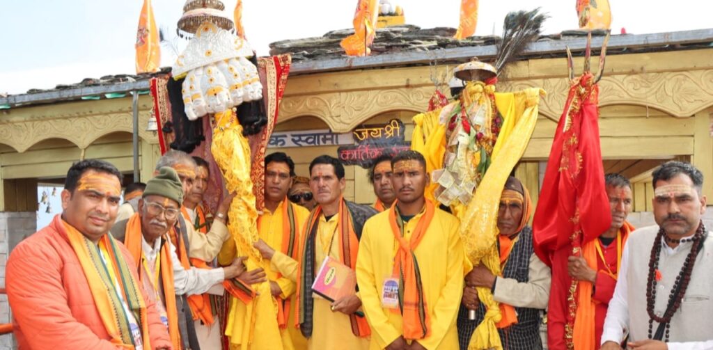 ऊखीमठ : पट्टी तल्लानागपुर के शीर्ष पर विराजमान क्रौच पर्वत पर जगत कल्याण के लिए तपस्यारत देव सेनापति कुमार कार्तिकेय की प्रथम ऐतिहासिक बदरीनाथ यात्रा क्रौच पर्वत तीर्थ से रवाना होकर प्रथम रात्रि प्रवास के लिए चमोली पोखरी के निकटवर्ती गांव सतूड के कार्तिक स्वामी मन्दिर में पहुंच गयी है। भगवान कार्तिक स्वामी की बदरीनाथ यात्रा में सैकड़ों नर – नारी शामिल होकर पुण्य अर्जित कर रहे है तथा विभिन्न हिल स्टेशन व गांवों में भगवान कार्तिक स्वामी की यात्रा का पुष्प अक्षत्रों से भव्य स्वागत किया जा रहा है तथा चन्द्र शिला क्षेत्र का वातावरण भक्तिमय बना हुआ है।